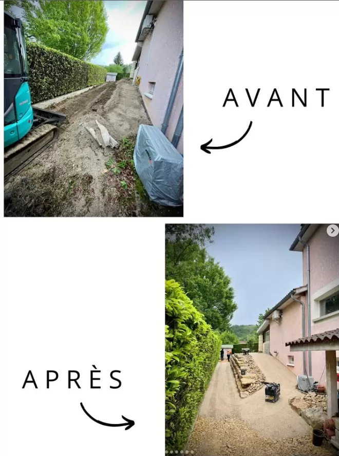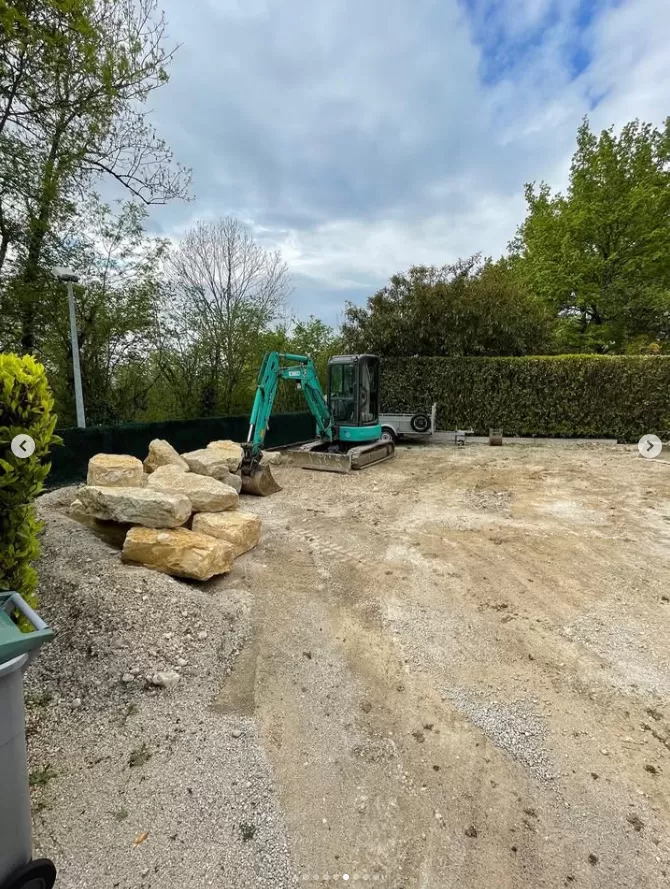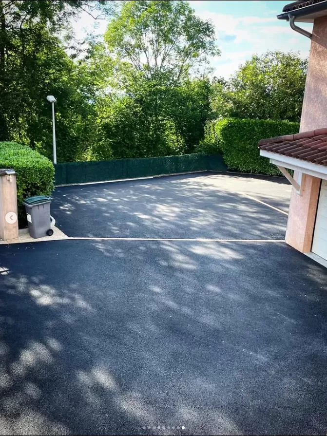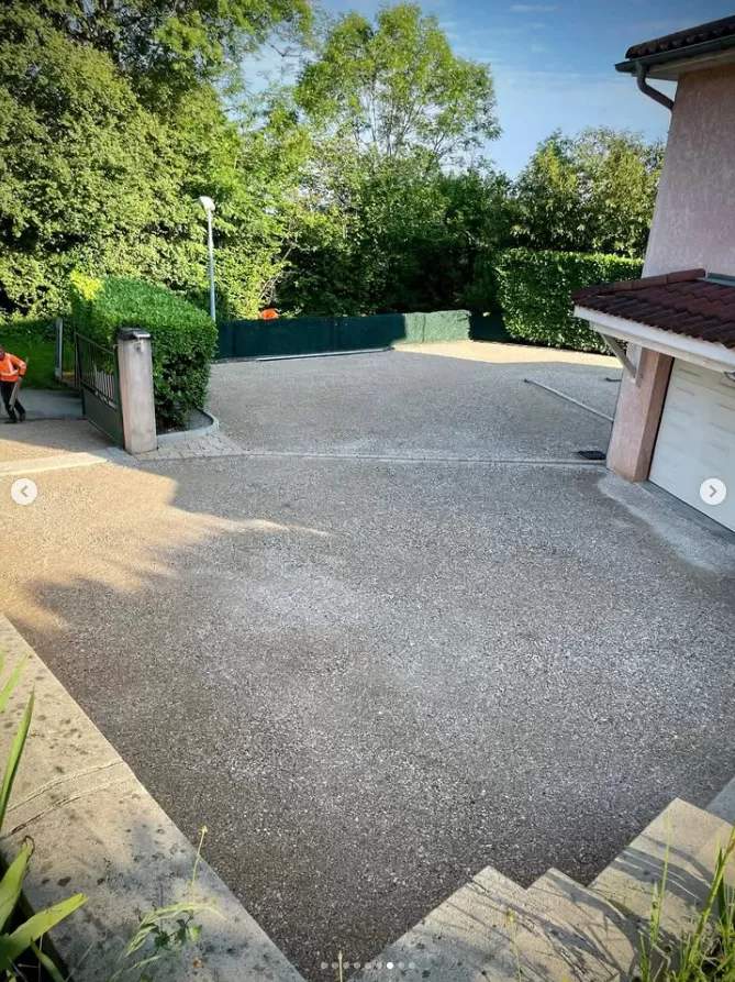 Les différentes phases de ce chantier comprennent le terrassement, la mise en place de 0/4 Sault Brenaz, la préparation d’une couche de 0/20 ainsi que la création de petits massifs décoratifs agrémentés de cailloux drainants. L’ensemble de ces travaux contribue à une finition soignée et à une durabilité renforcée. Pour un espace plus pratique, l’aménagement s’est complété par la mise en place de l’enrobé sur un parking, garantissant un rendu à la fois robuste et esthétique.